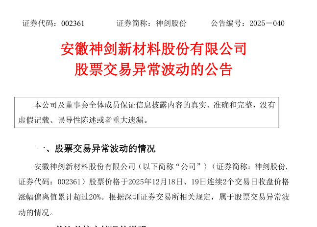12月21日晚間,神劍股份發(fā)布股價異動公告。因連續(xù)兩個交易日(12月18日、19日)累計(jì)漲幅偏離值超過20%,公司股票交易出現(xiàn)異常波動。公司表示,經(jīng)自查及向控股股東問詢,目前經(jīng)營內(nèi)外部環(huán)境未發(fā)生重大變化,不存在應(yīng)披露未披露的重大信息,也未發(fā)現(xiàn)信息泄露或違規(guī)買賣股票的行為。