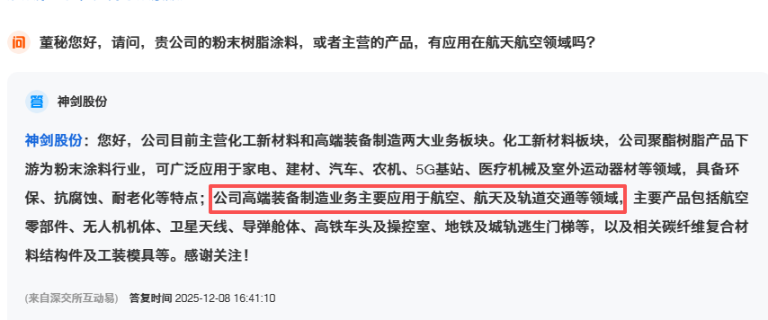 根據(jù)公司董秘在互動平臺的披露,其高端裝備制造板塊已是中國航天科技集團(tuán)的供應(yīng)商,主要提供衛(wèi)星天線、反射器、導(dǎo)彈艙體、無人機(jī)機(jī)體等關(guān)鍵零部件及碳纖維復(fù)合材料結(jié)構(gòu)件。這意味著,神劍股份的產(chǎn)品已從涂覆物體表面的“防護(hù)層”,深入到構(gòu)成航天器主體的“骨骼”與“器官”。
