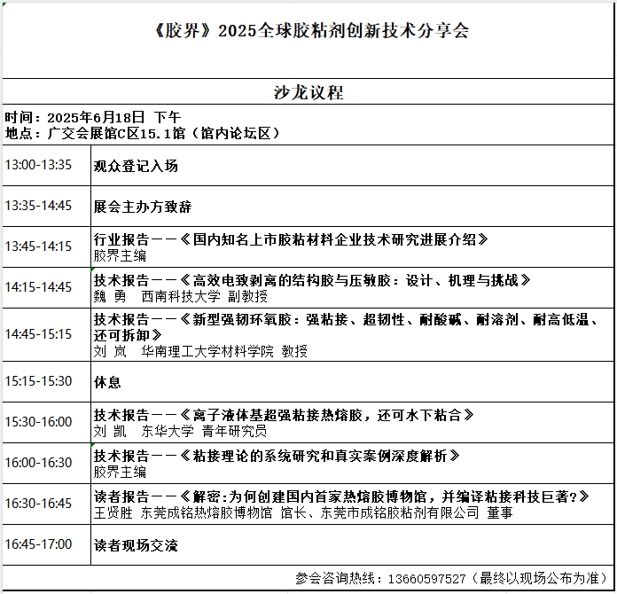 借此,《膠界》將攜手廣東智展展覽有限公司、中涂聯(lián)合國際會展(廣州)有限公司等單位,首次在廣州“2025廣州國際膠粘劑及粘接技術(shù)展”、“ICIE 2025國際(廣州)涂料工業(yè)展”期間同期舉辦線下的全球膠粘劑創(chuàng)新技術(shù)分享會!它不會是一場普通的膠粘劑會議。在這里,我們將邀請《膠界》主編與大家分享他與膠粘劑的故事,他將首次公開與讀者進行面對面的專業(yè)交流與深度對話。同時,也將邀請獨具創(chuàng)新技術(shù)的行業(yè)專家到場,分享他們最新的研究成果和寶貴的實踐經(jīng)驗,把膠粘劑技術(shù)的最新進展分享給大家。