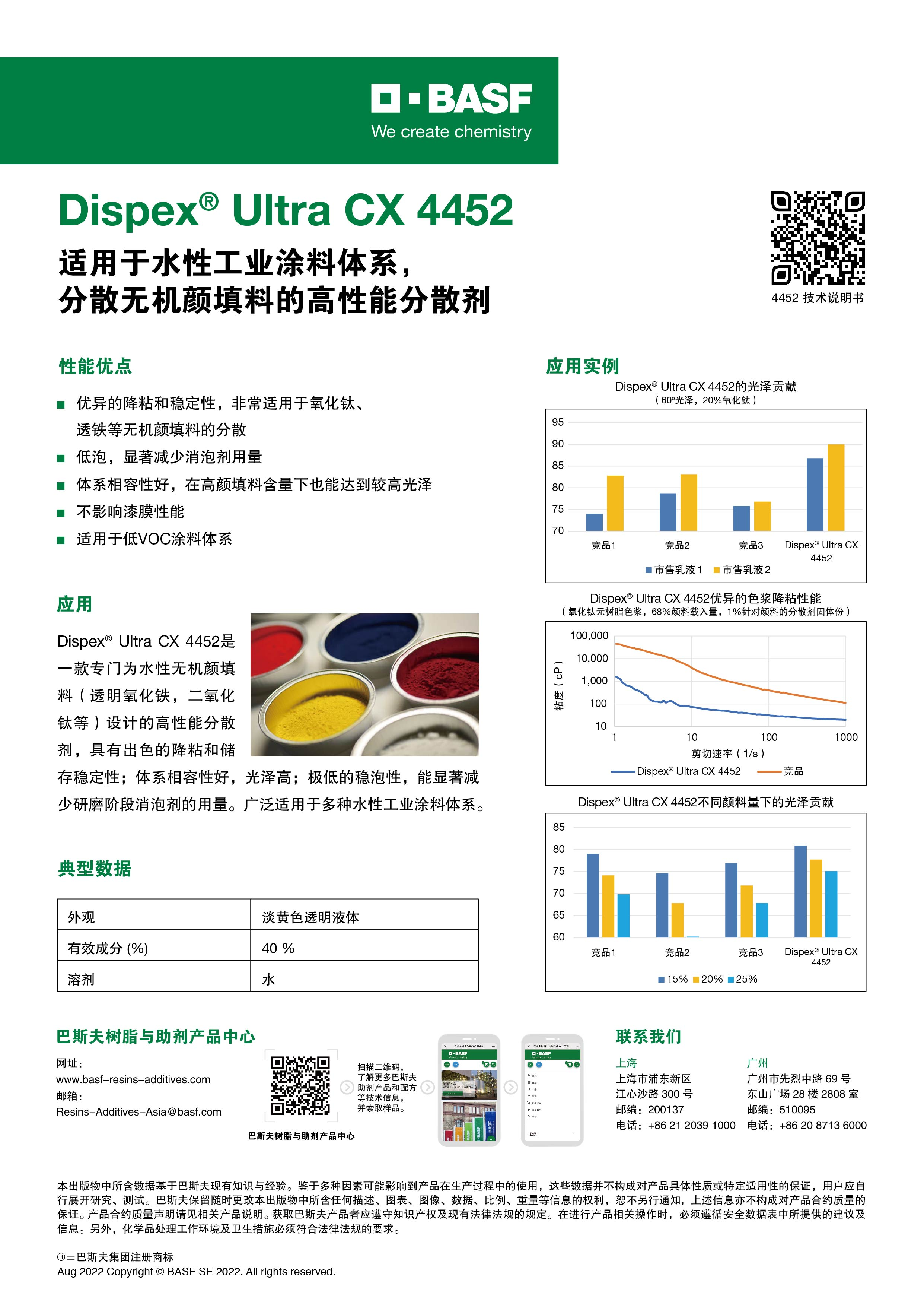 Dispex Ultra CX 4452適用于無機顏料和填料的水性高性能分散劑。特別推薦用于水性木器涂料、木材防腐和高端建筑涂料。