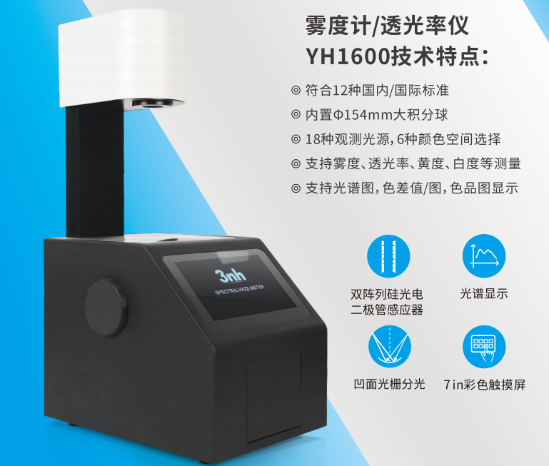 YH1810色彩霧度計可輕松實現(xiàn)ASTM D1003 非補償法、ISO 13468補償法,全透光率、霧度測試,清晰度測試,